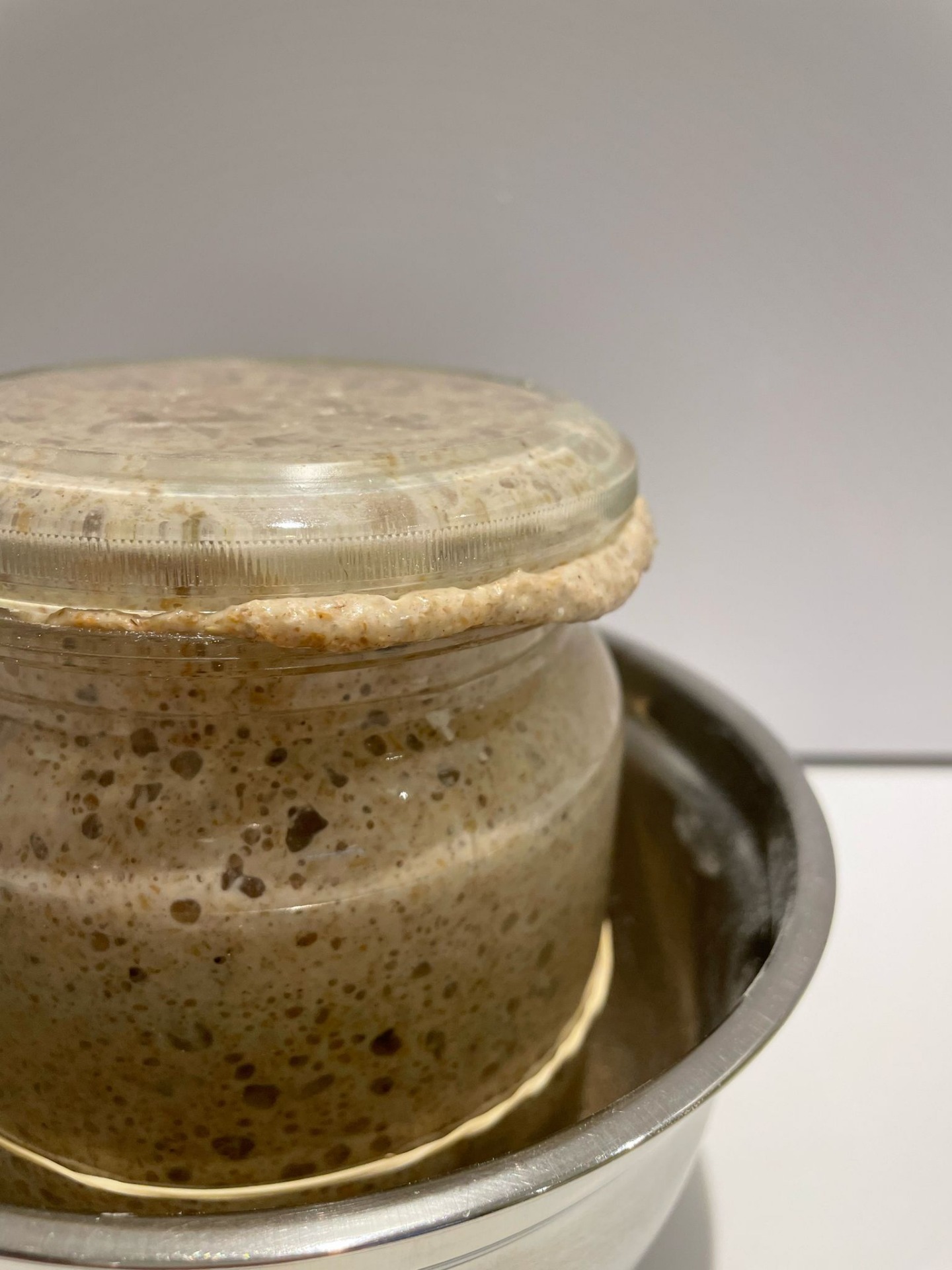 Daaraan wordt er een gelijke hoeveelheid water en meel toegevoegd en gaat de fermentatie verder tot het luchtig en krachtig genoeg is om het deksel van de pot te duwen.