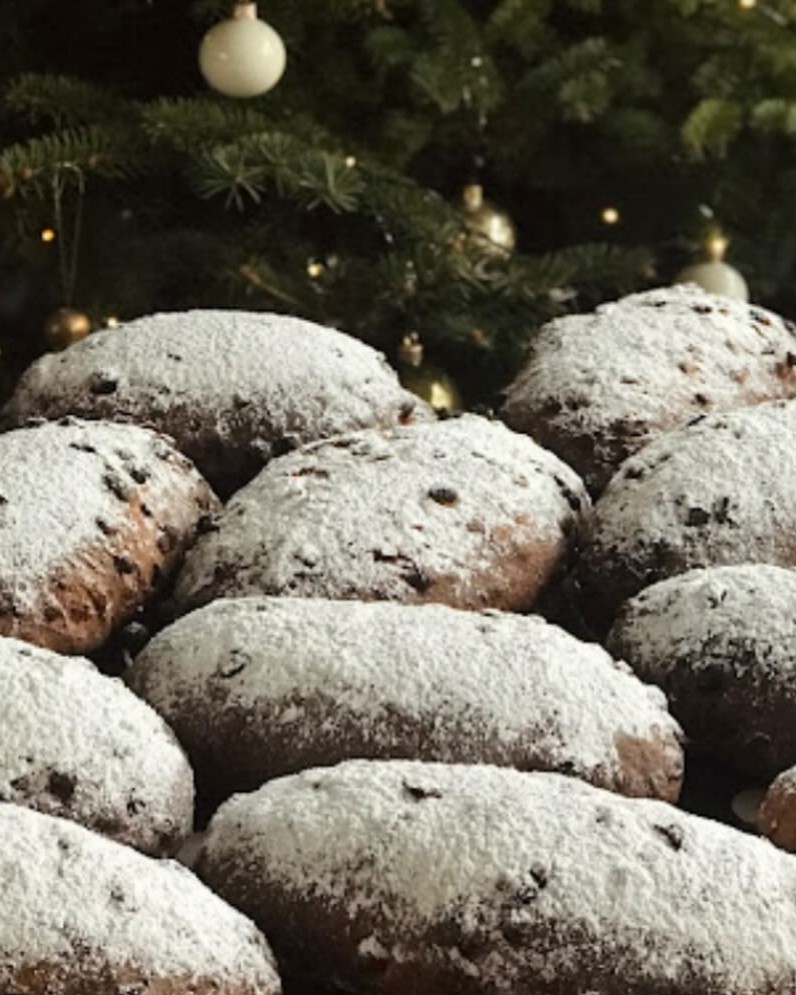 • Een kerststol op basis van desem, rijkelijk gevuld met rozijnen, gekonfijt fruit, amandelschilfers en amandelspijs.